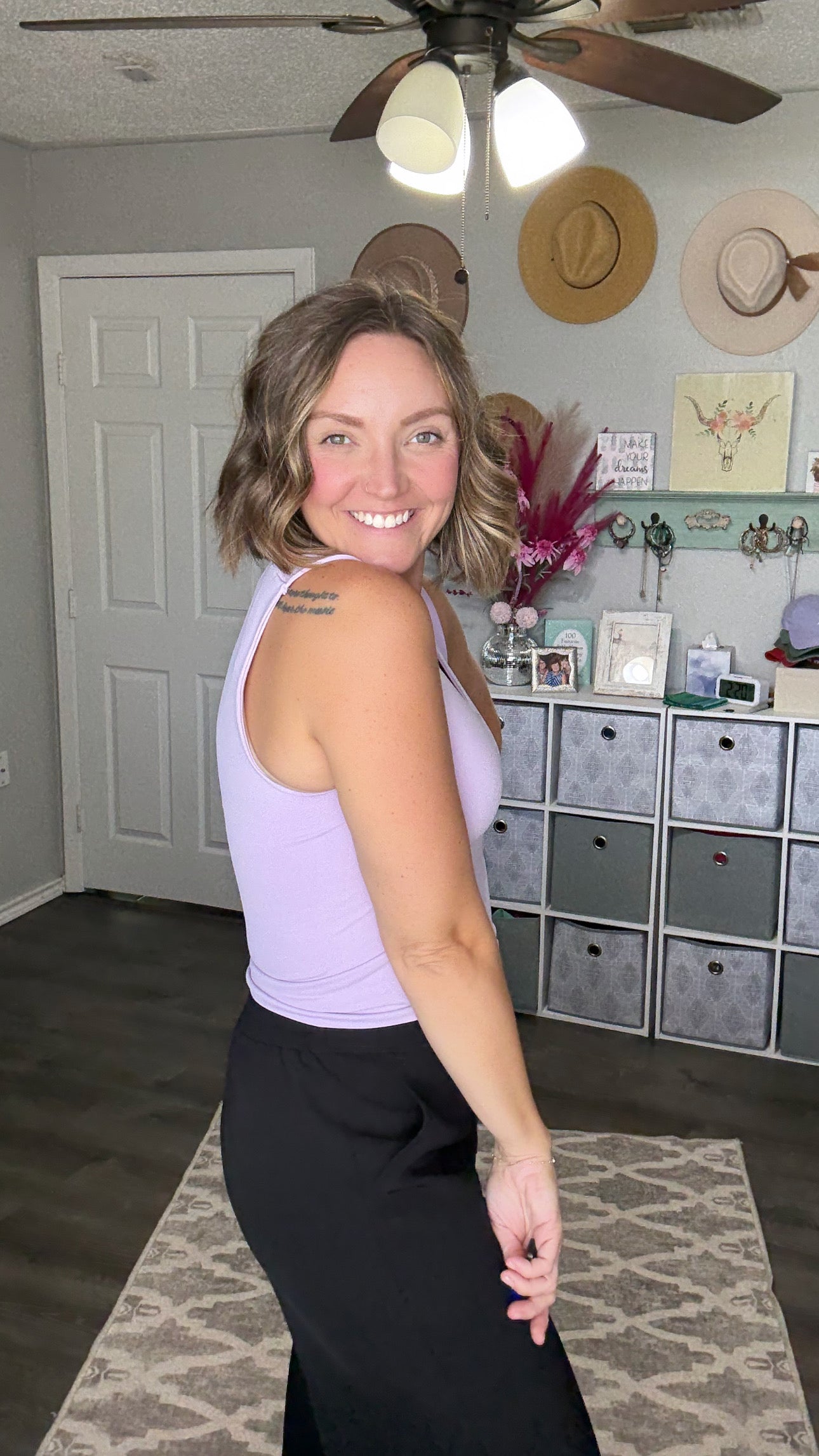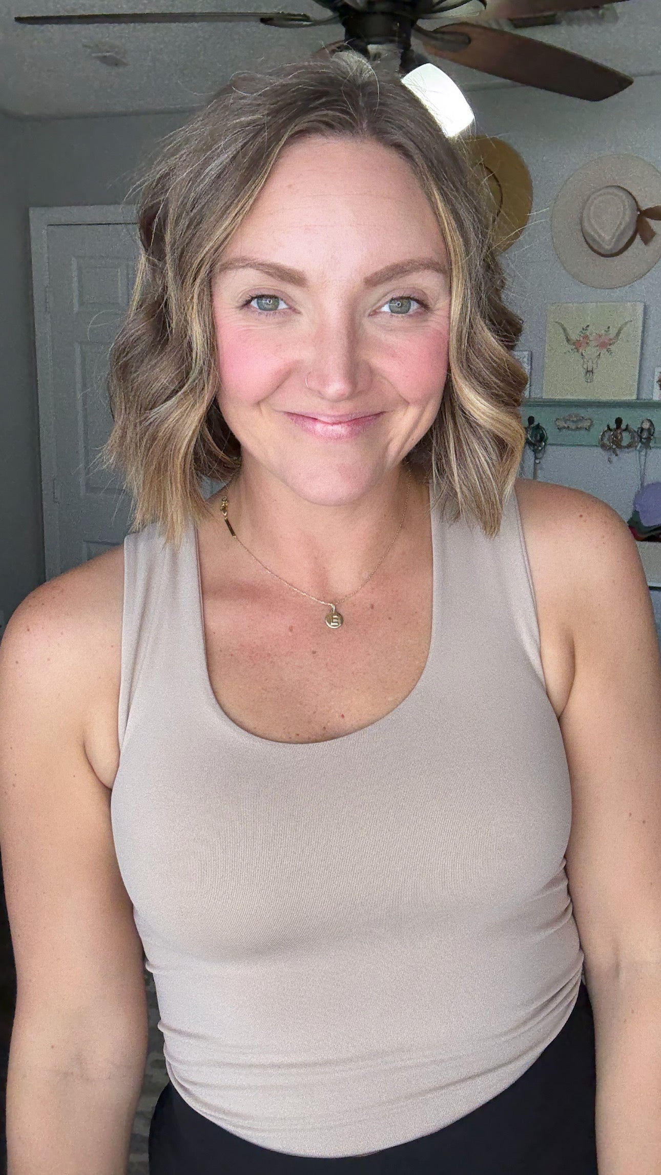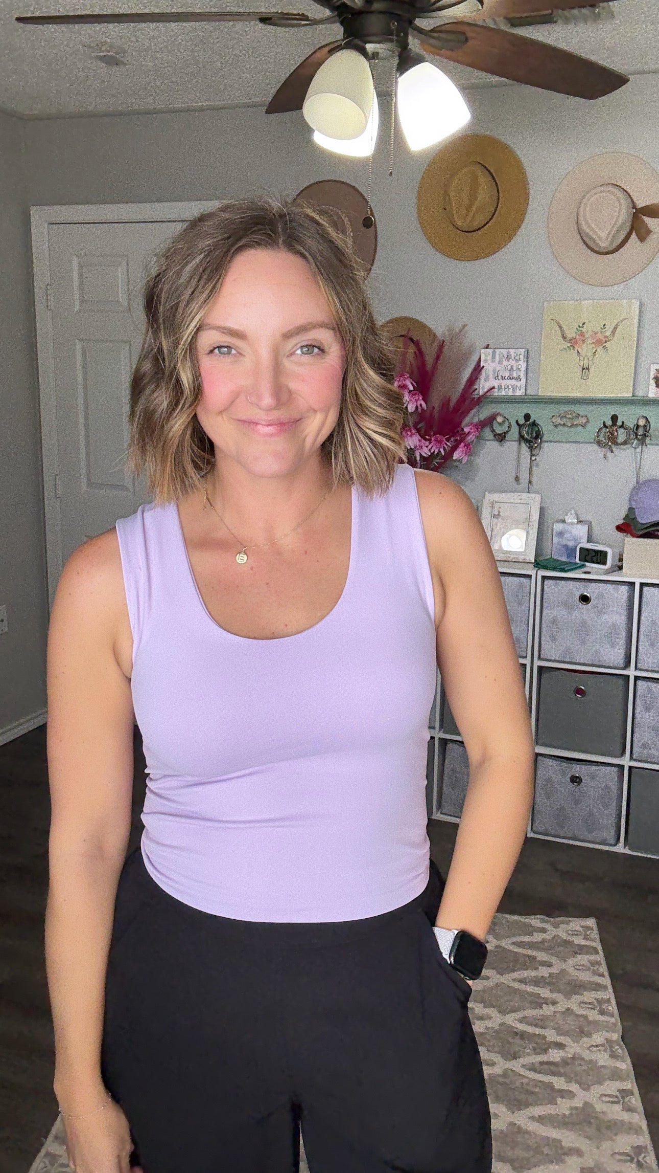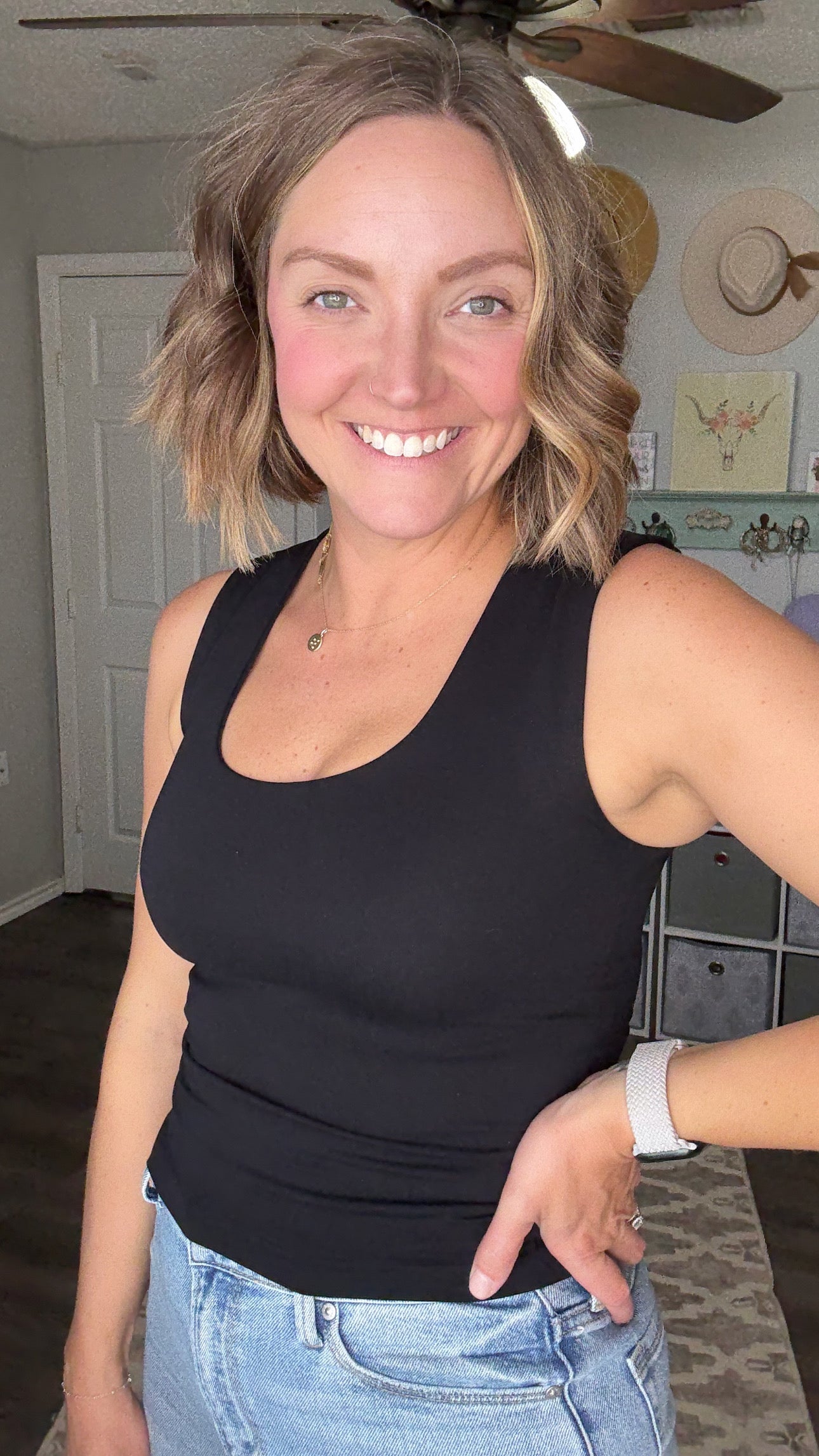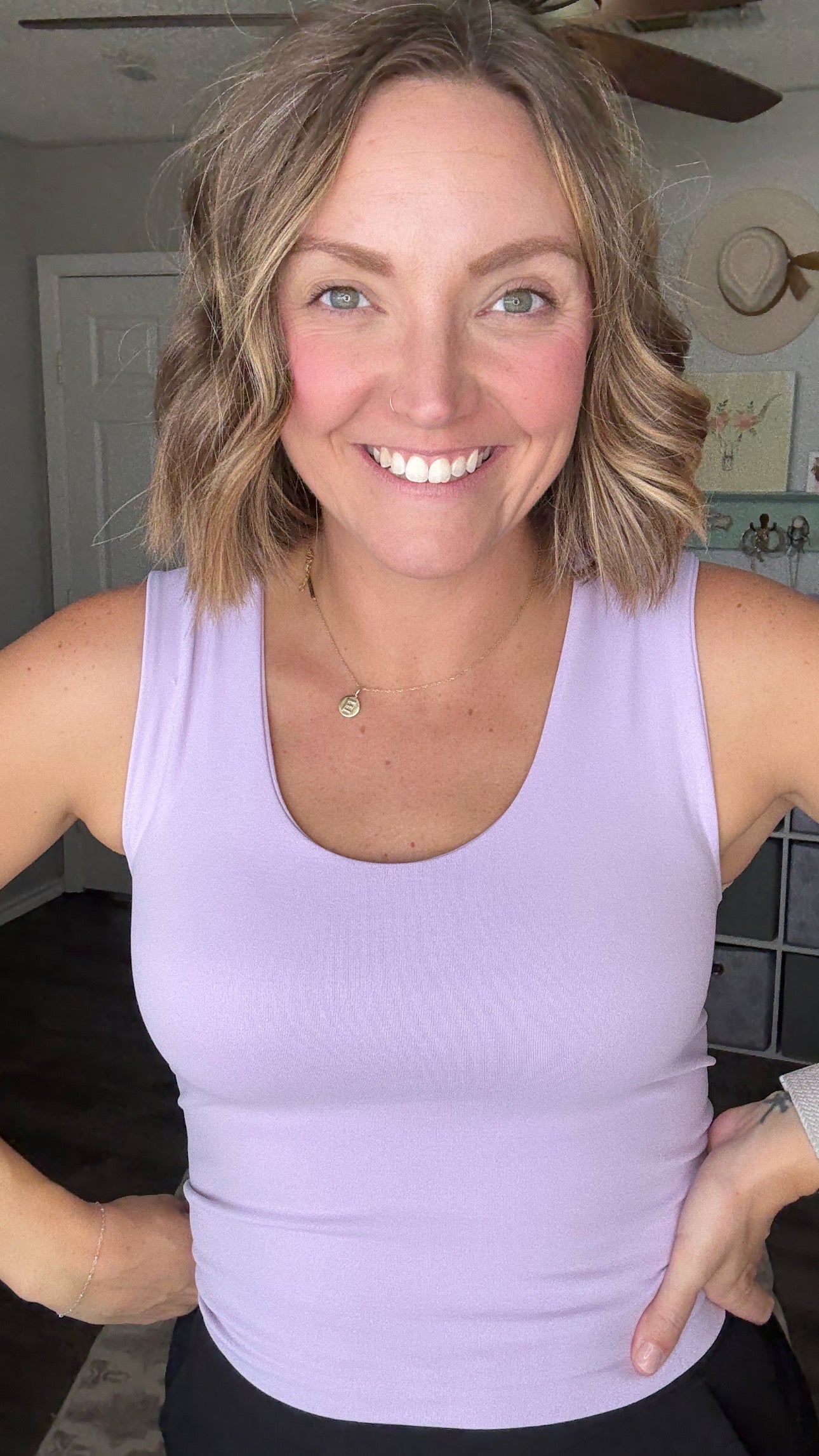 Your new go-to basic, but better. This essential double-layered tank features a sleek, buttery-soft fabric with a built-in second layer for extra coverage and a smooth, flattering fit. The scoop neckline and wide straps make it bra-friendly and perfect for layering — or wearing solo on warm days.